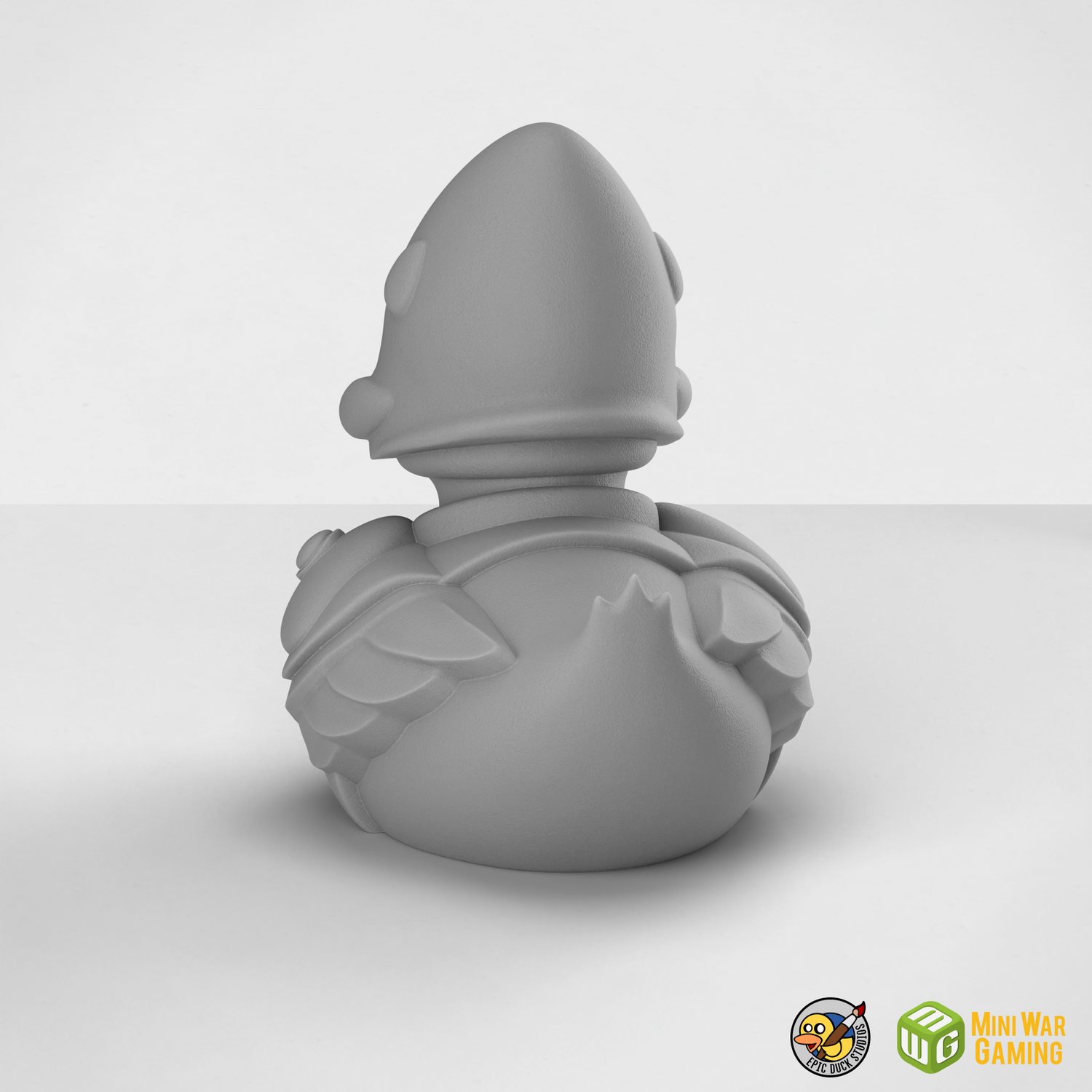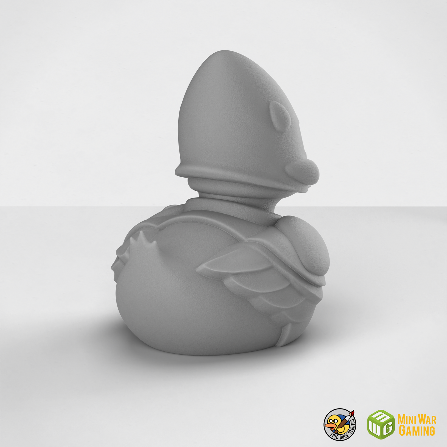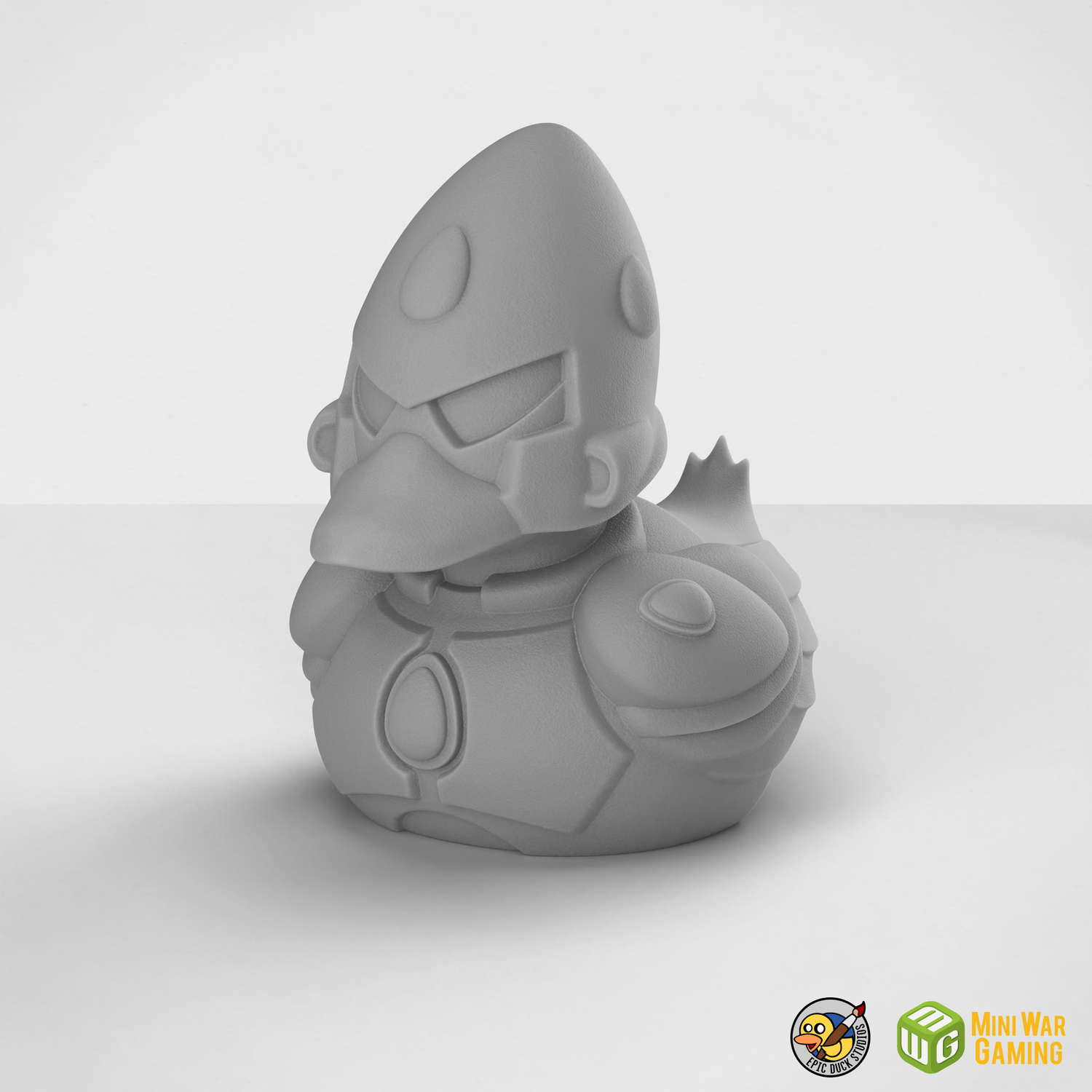 This cosmic canard comes decked out in dazzling conical helmetry and sleek space elf armor that's bound to make other miniatures green (or should we say teal?) with envy. Adorned with shimmering gems reminiscent of interstellar rubber ducks gone rogue, it’s got no need for weapons when style alone could conquer galaxies.