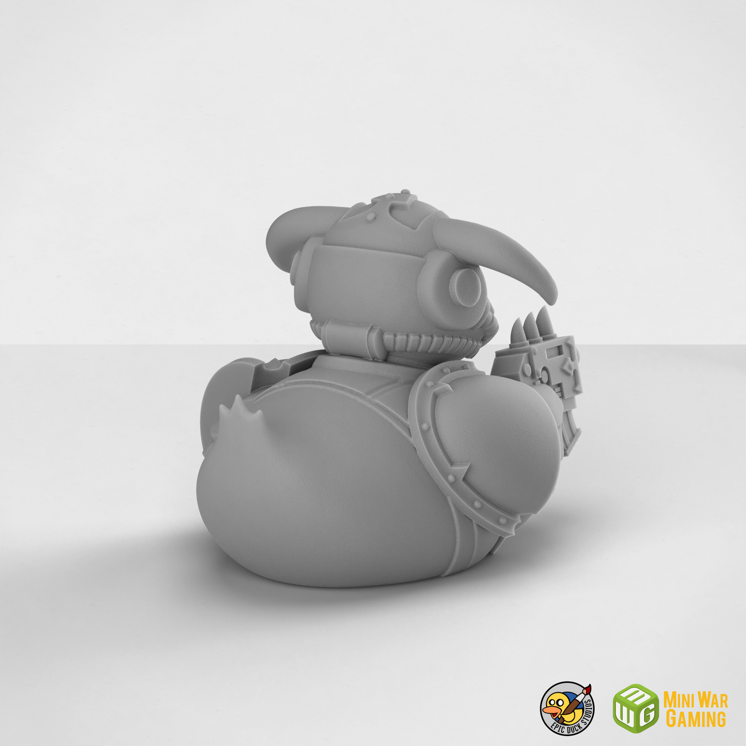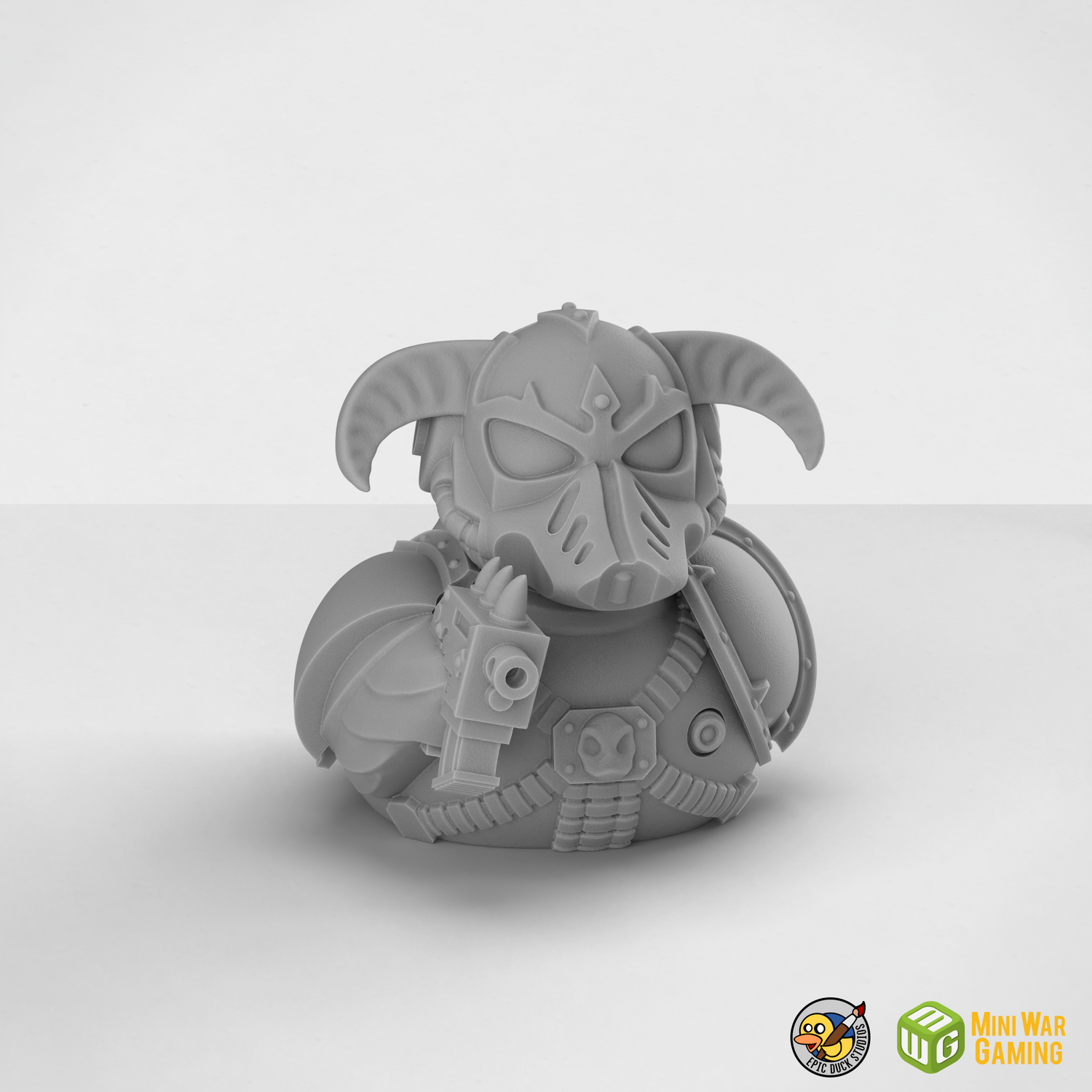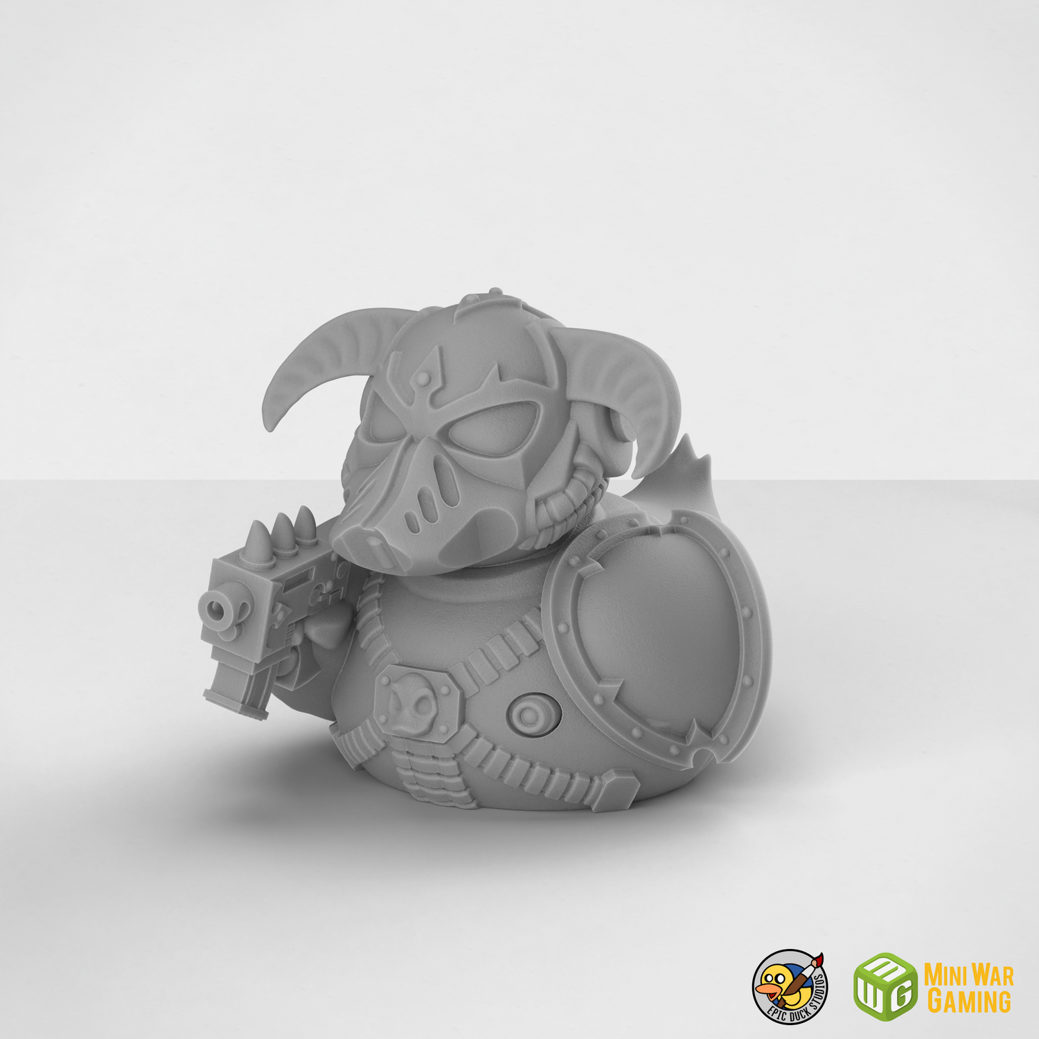 Armed with its trusty pistol and clad in menacing power armor complete with horned helmet, this rubbery marine is ready to ruffle some feathers. Its spiky edge trim screams "chaos," while maintaining just enough whimsy for you not to take it too mallardly—truly making it stand out among other miniatures!