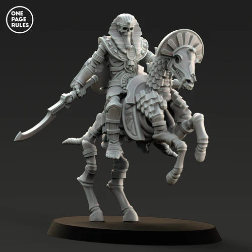 Command the battlefield with OnePageRules' Mummified King Mounted on Royal Skeleton Steed, a striking figure from their esteemed Age of Fantasy range. This meticulously crafted miniature showcases an unparalleled level of detail and quality that sets it apart in any wargaming collection.