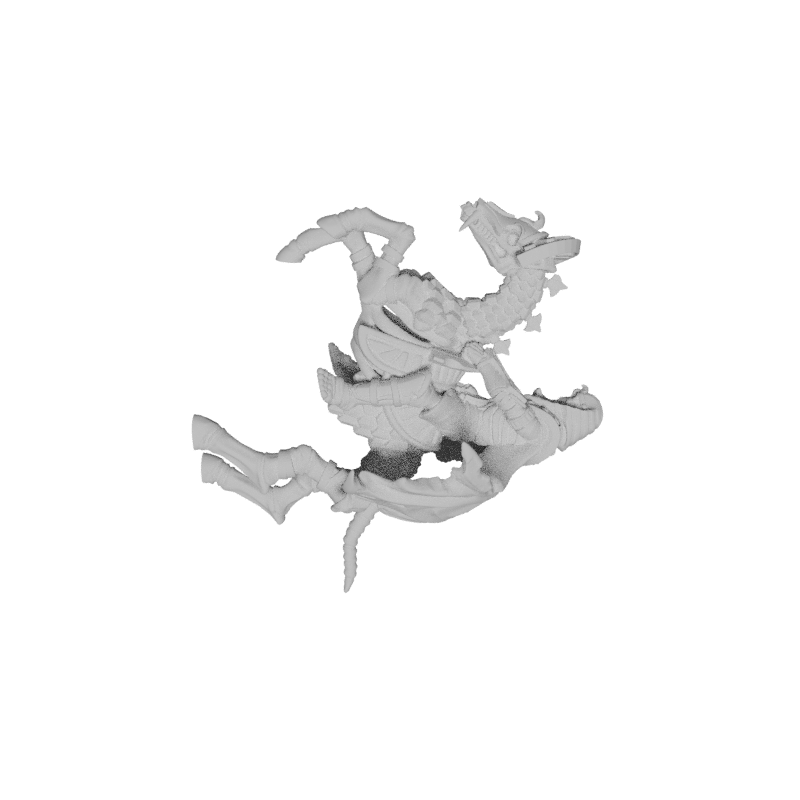 His mount, equally imposing - not flesh but bone – echoes its master’s defiance against mortality: An equine skeleton draped in tattered remnants of royal capes and postiche. Its hooves strike sparks off cobblestones while it carries its undead liege into battle wearing greaves, bracers and an armored collar befitting royalty.