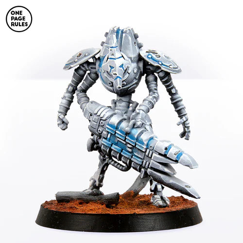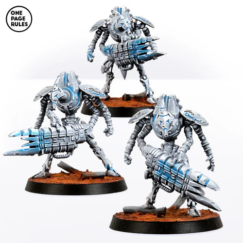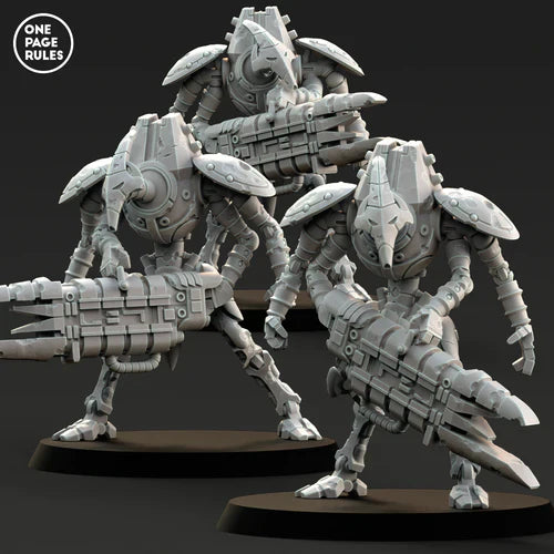Each model in this elite infantry trio is armed with an imposing heavy cannon and fortified by alien-crafted pauldrons and backplate armor - all designed intricately on their four-armed robotic frames. The metallic sheen of each robot reflects its high-quality construction while emphasizing its role as an unyielding bulwark against adversaries.