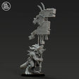 This single model comes equipped with an imposing banner that's adorned in Aztec-style symbols, adding depth to its character while enhancing gameplay aesthetics. The figure itself boasts ornate features such as scales, feathers, spikes on his helmet - all reminiscent of ancient Mayan culture – making it not just another infantry unit but rather an elite standard bearer (BSB) representative of lizardman warriors.