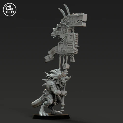 Lead your troops to victory with the Saurian Army Standard Bearer, a masterfully crafted miniature from OnePageRules. This exceptional piece is part of their esteemed Saurians product line for Age of Fantasy and stands out due to its intricate detailing and superior quality.