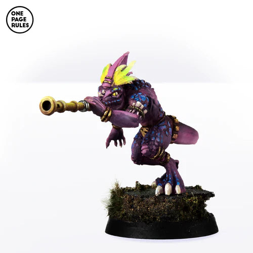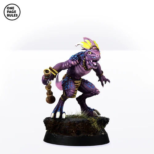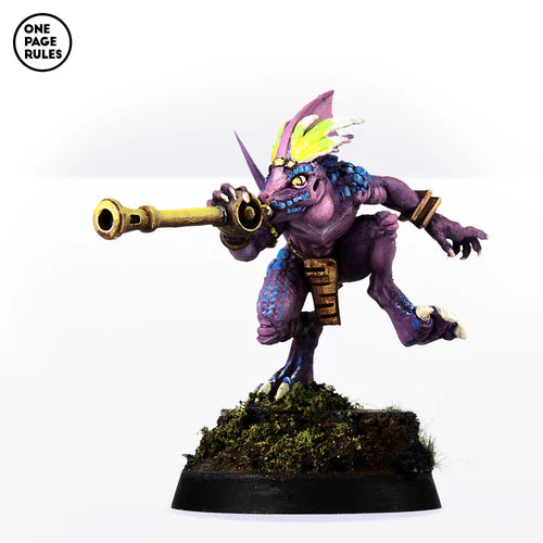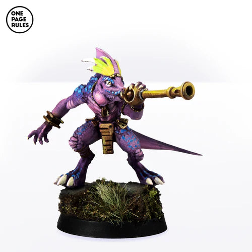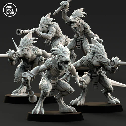 Dart through enemy lines with the Saurian Geckos with Blowpipes, a striking addition to OnePageRules' Age of Fantasy collection. These meticulously crafted miniatures are renowned for their intricate detailing and high-quality 3D printing.