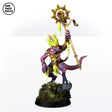 This single model is armed with an ancient staff, symbolizing its powerful magical abilities. The figure's design stands out due to distinctive features such as vibrant scales, delicate feathers adorning its headgear and body armor inspired by Aztec broad collars - all contributing towards creating this unique Lizardman wizard character.