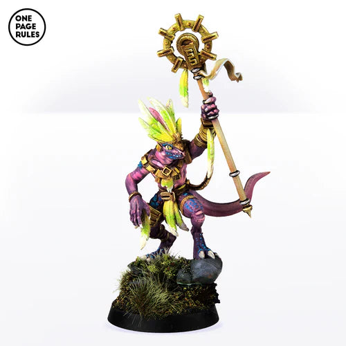 Command the mystical forces with the Saurian Gecko Priest Miniature, a masterful creation from OnePageRules' esteemed Saurians product line. This exceptional piece showcases intricate craftsmanship and attention to detail that brings your Age of Fantasy games to life.