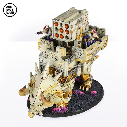 This mounted creature comes armed with rockets ready for launch, encased in alien armour plating as tough as its triceratops head shield. The howdah atop this dinosaur beast carries a lizardman warrior adorned in Aztec-inspired gear while his trusty gecko companion scouts ahead - truly setting this model apart within any infantry or monster lineup.