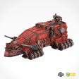 Imagine the howling nebula winds buffeting across the blasted surface of Gothmayr, where a fortress of shattered steel rises behind a roaring charge. Out from a cloud of phosphor-painted dust lurches a monstrous craft—jagged panels bolted over old hull scars, tank-tread repulsors grinding over debris while dual long-barrel autocannons level their cold gaze at rival gangs. Its asymmetrical, brutalist silhouette is thrown into high relief by the side-mounted rotary chain guns, all while an angular sensor array swivels atop the cockpit, hunting for threats or fresh plunder with an unblinking, predatory calm.