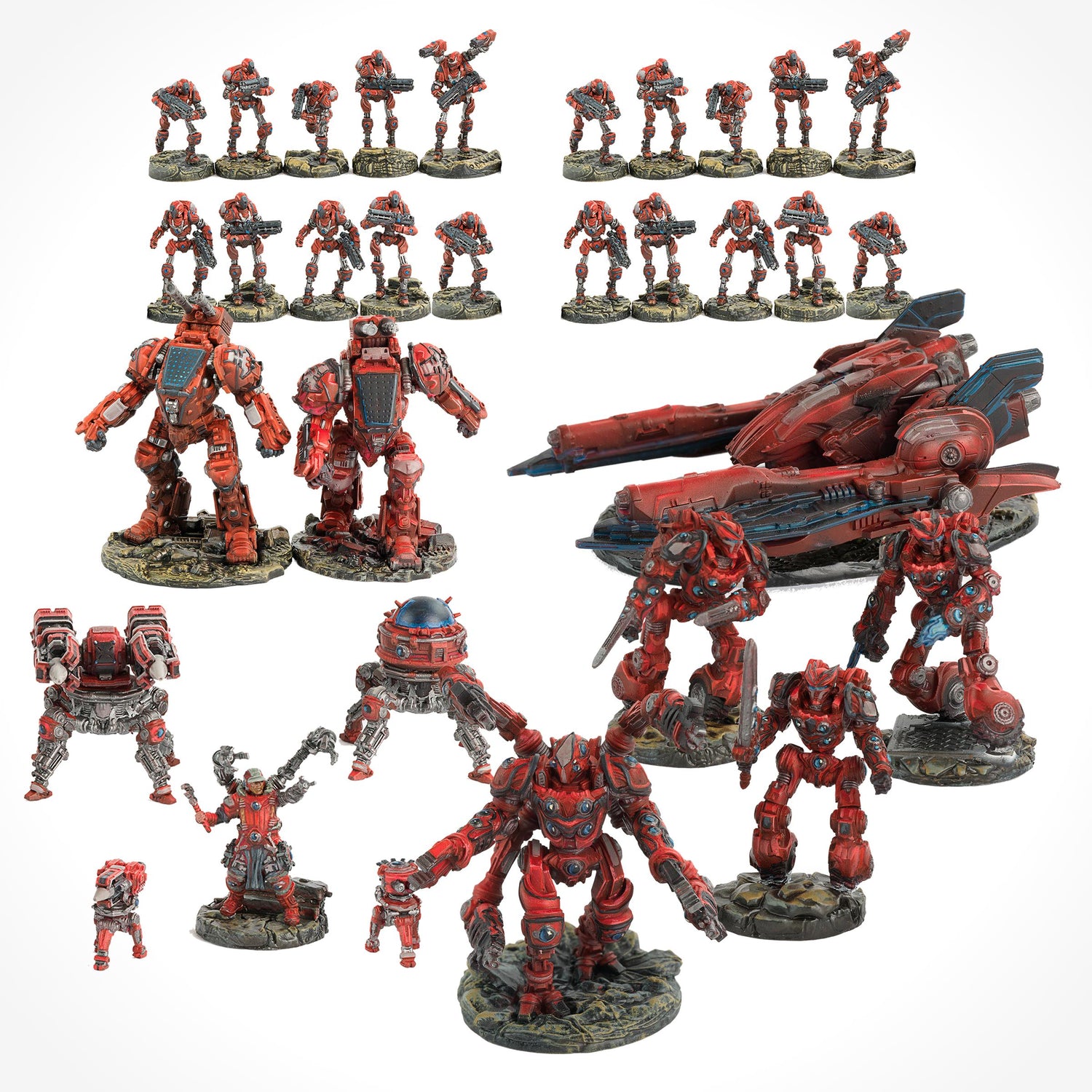 Armed with plasma rifles, power claws, heavy rotary cannons, and drone-mounted laser blasters, the Steel Infantry hit the field clad in thick combat plating laced with illuminated paneling and mechanical joints. From sensor arrays and tactical visors to command modules, skeletal-limbed bots, and a man-machine hybrid commander, this force of advanced drones and a mechanical dreadnought bristles with heavy weapons and embodies the Steel Specters’ spectral sci-fi identity.